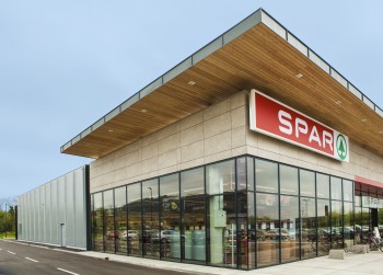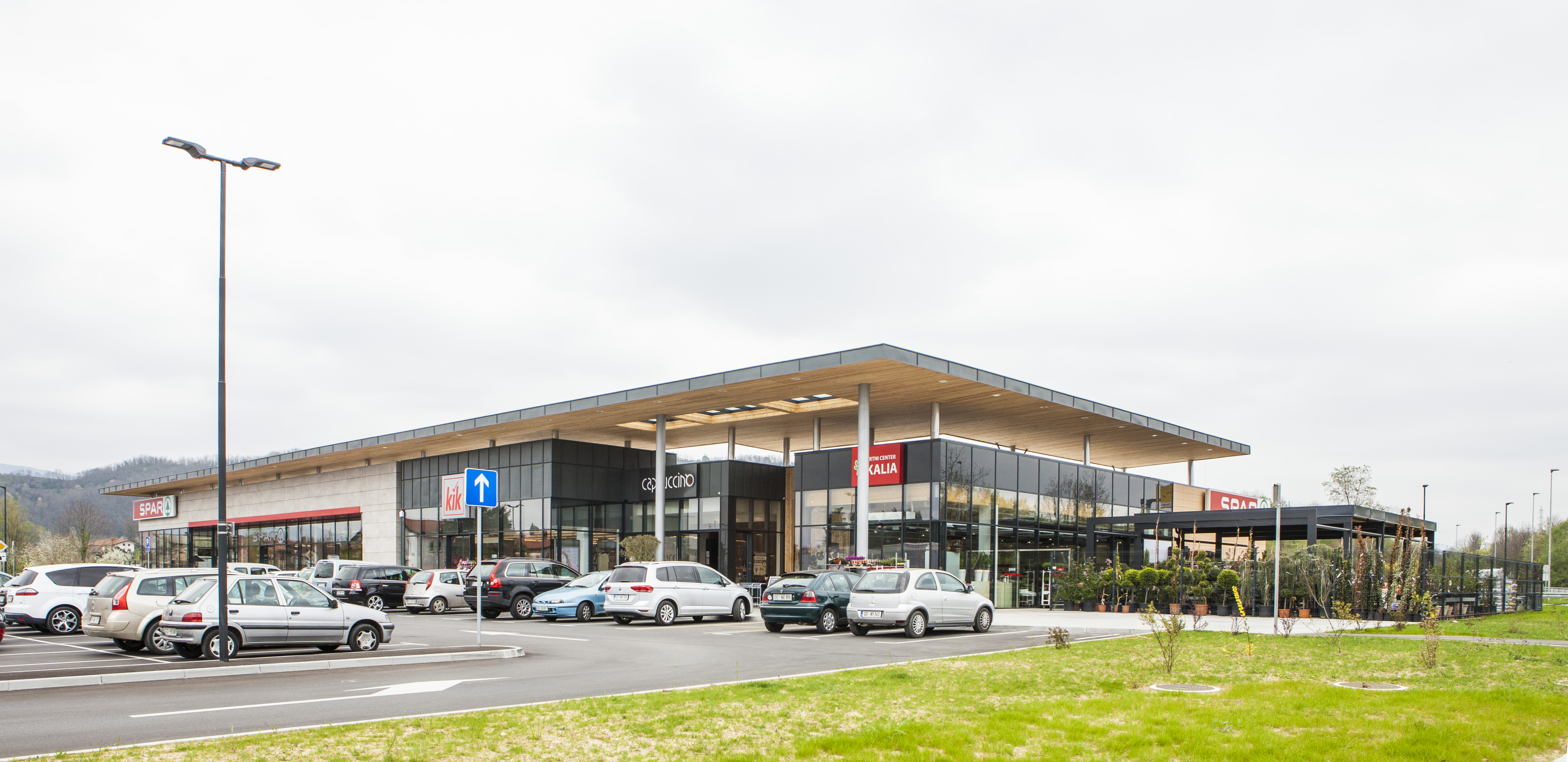 Trgovinski objekt Spar smo prekrili z ravno strešno membrano Bauder Thermofol U18. Fasado objekta smo obložili s Kingspan izolativnimi paneli in z Rhainzing pločevino.